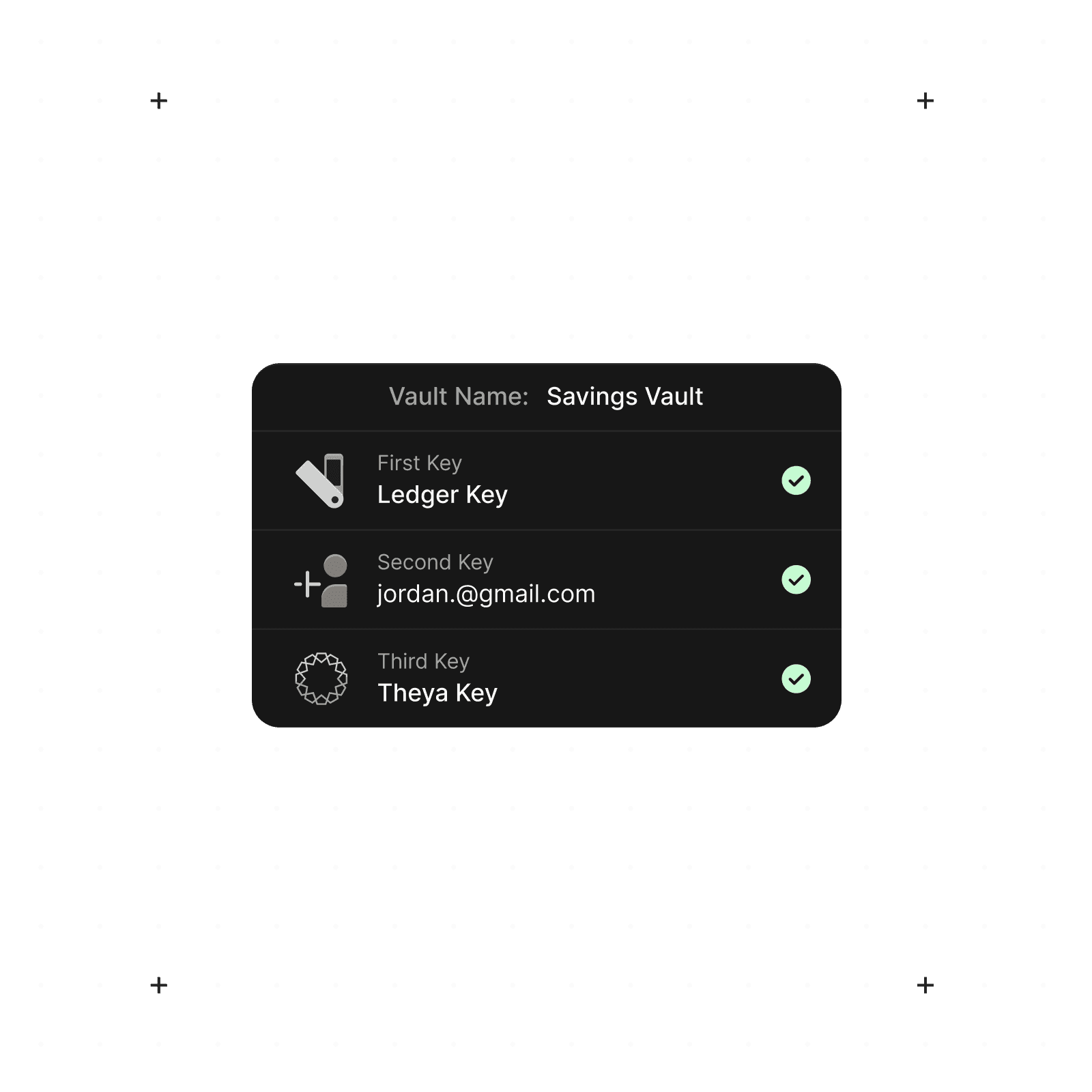 Theya’s modular vault architecture gives you total control over your digital assets. Whether you’re managing funds alone, with a partner, or across a team, our flexible setup supports single or multi-party access, robust permissions, and hardware-grade security without compromising usability.